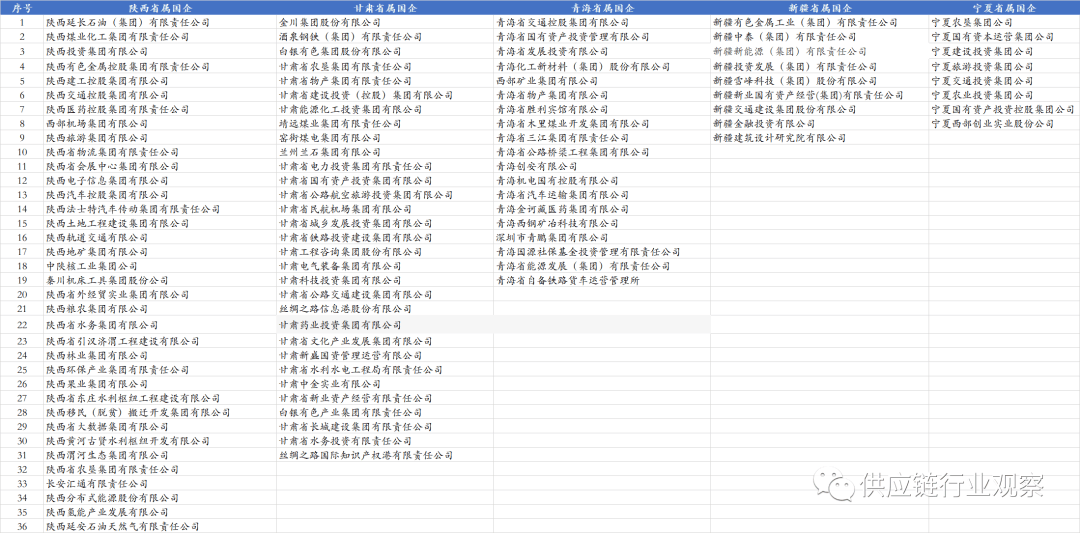 西北5省分别为陕西、甘肃、宁夏、新疆和青海。西北5省共拥有103家省级国企,其中陕西数量最多36家、甘肃31家、青海19家、新疆9家、宁夏8家。