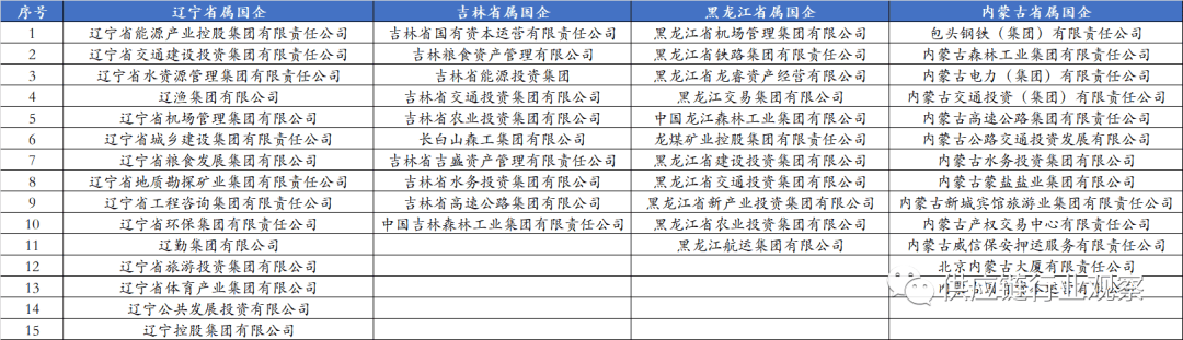 23-27为通信及电子信息央企,分别为:中国电信、中国联通、中国移动、中国卫星网络集团、中国电子信息产业集团;28-33为装备制造类央企,分别为:中国一汽、东风汽车、中国一重集团、中国机械工业集团、哈尔滨电气集团、中国东方电气集团;34-37为矿产资产类央企,分别为:鞍钢、中国宝武、中国矿产资源集团、中国铝业集团;